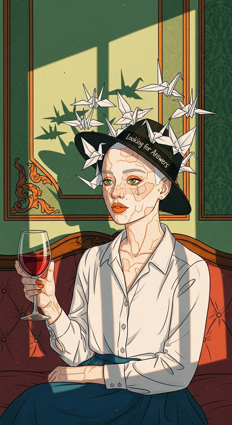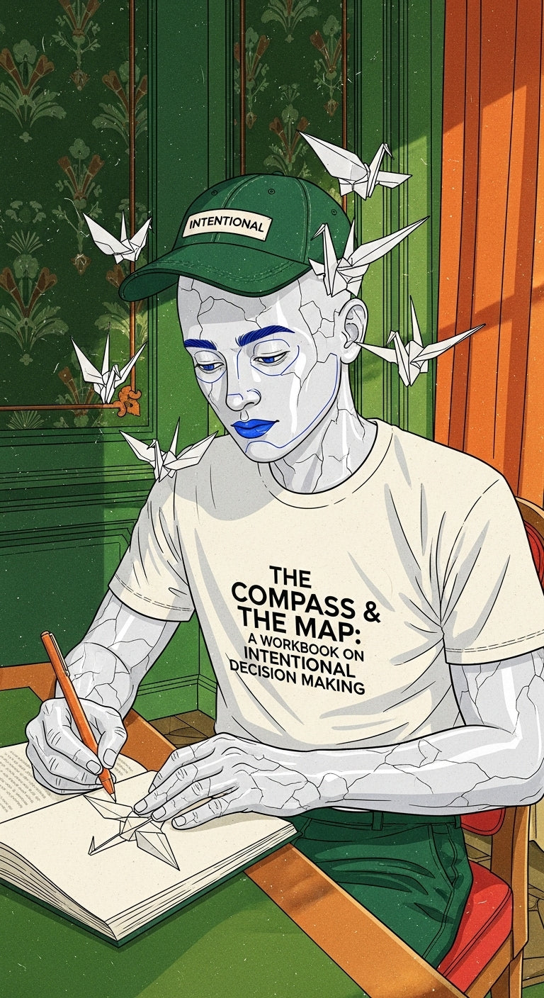 This represents the process of intentional transformation—the action taken after introspection. Using the insights gained from our fractures, we begindefining the folds. Each crease is a deliberate, clarifying choice, transforming a fragile past into a structured future. The finished bird is the outcome: resilience, direction, and flight.